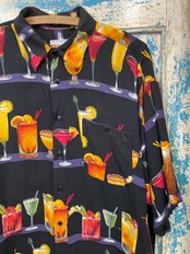 カラフルな色味とカクテルデザインが映えるアロハシャツです。シンプルになりがちな夏服にいかがでしょうか。